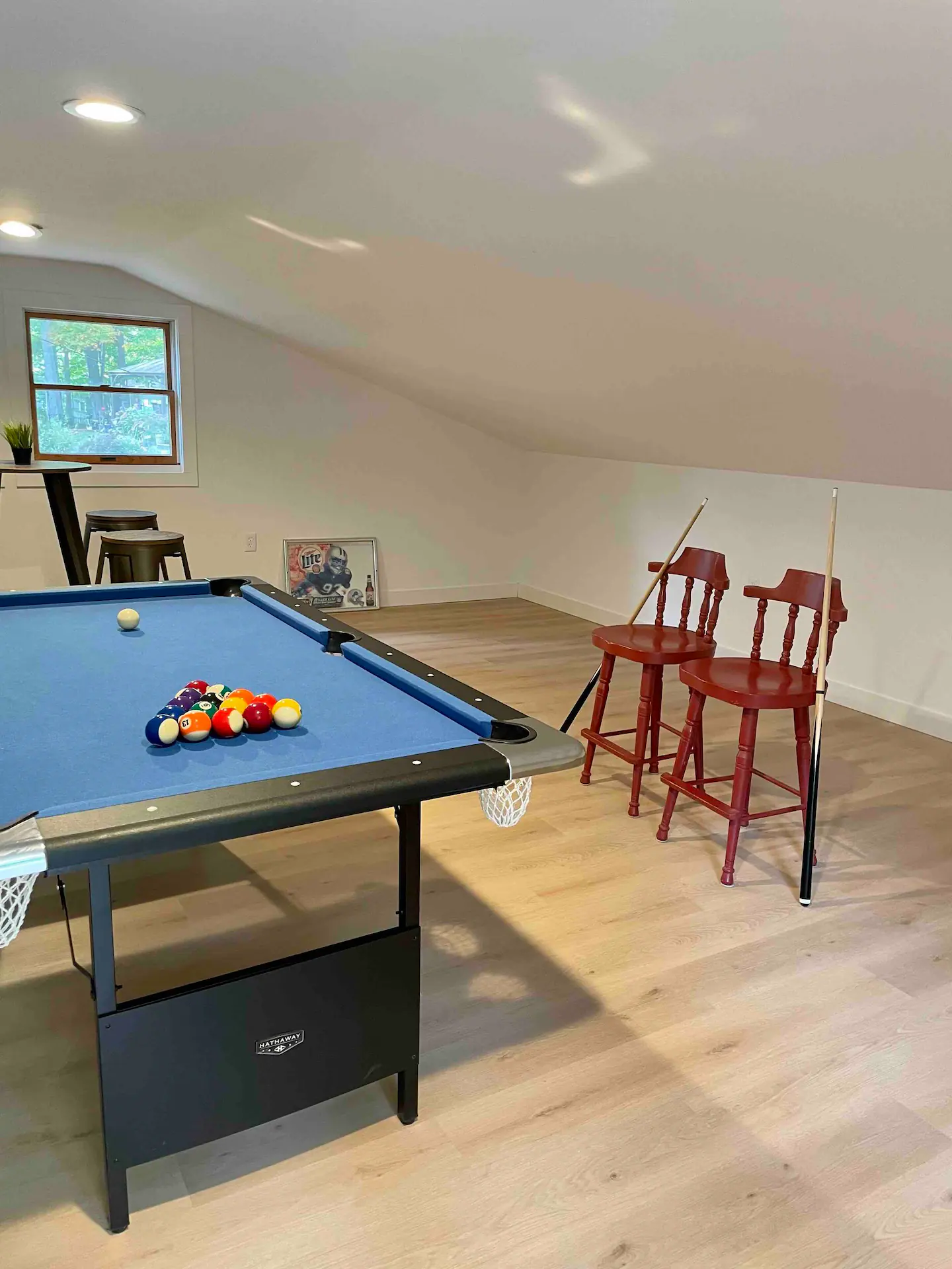 – Game room loft above garage with a 6-foot pool table, tv, lounging area with bean bags & game console, and BRAND NEW to 2024 NBA Jam Arcade Game.