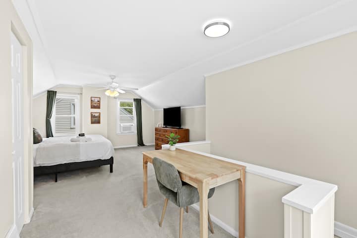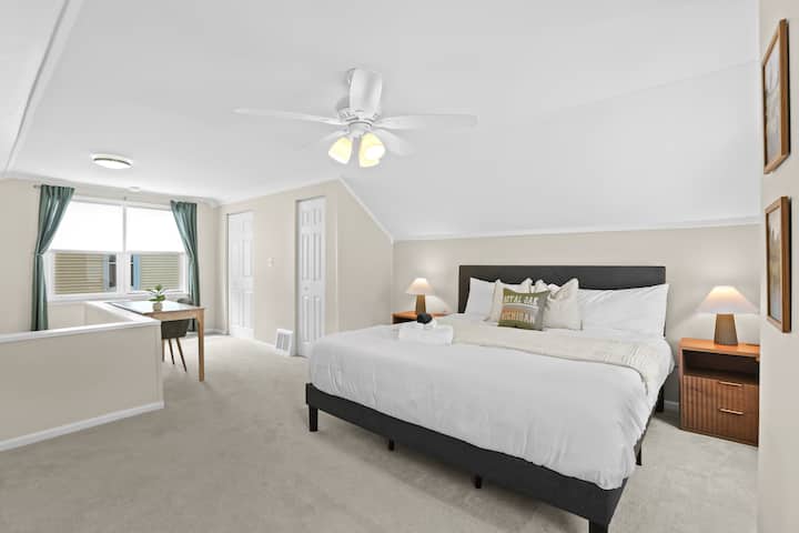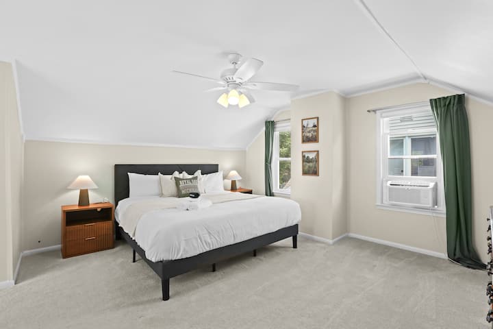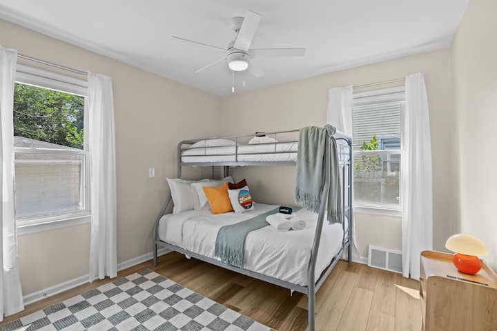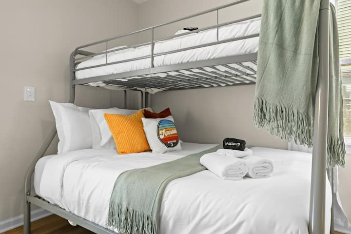 -Second Floor: 3 bedrooms (2 queen beds, 1 bunk with full, twin, and twin trundle), plus a full bath. Workspace in one bedroom.